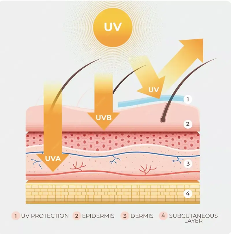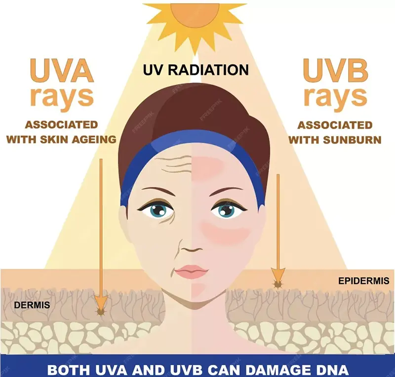 UVA zein UVB larruazaleko kalteak eragin ditzakete, baina haien ondorioak desberdinak dira batez ere sartze-sakoneragatik. Bistan denez, UVA aberatsagoak dermisean sakonago sar daitezke eta fotozahartzearekin erlazio zuzenagoa da, ROS sortuko baitute eta kolagenoa eta elastina degradatuko baitituzte, eta horrek zimurrak, larruazaleko elastikotasuna galtzea eta zahartze goiztiarreko beste seinale batzuk eragingo ditu. Aitzitik, UVB-k epidermisari eragiten dio batez ere, eguzki erredurak (eguzki-eritema) eta melanina-ekoizpena eraginez epe laburrean, eta epe luzeko esposizioak hiperkeratosia sor dezake eta larruazaleko tumore gaiztoak izateko arriskua nabarmen handitu dezake.