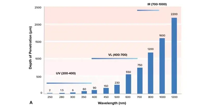 Goiko irudian ikusten den bezala, argi ikusgarriak larruazalean eragin handia du, banda honek azalean sartze-sakonera handiagoa duelako. Argi gorria epidermisan eta dermisean sar daiteke eta gantz-geruzara irits daiteke, uhin-luzeraren eta sartze-sakoneraren arteko erlazioa eta uhin-luzeraren eta energiaren arteko alderantzizko erlazioa adieraziz, argi urdinak argi gorriak baino energia handiagoa eta sartze-sakonera txikiagoa du.