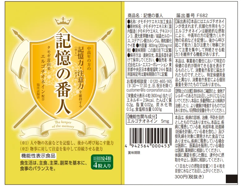 Japoniako LS Korporazioak abian jarritako ergotioneina osagarria adin ertaineko eta adineko pertsonen memoriaren gainbeherari aurre egiteko diseinatutako produktua da.