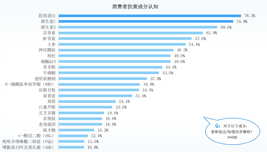 Merkatuaren hezkuntza eta garapenari esker, gaur egun kolagenoa oso ezaguna da "zahartzearen aurkako osagaia" kontsumitzaileen artean. Zahartzearen aurkako osagai nagusiak ulertzeko inkestan, kolagenoa (% 78,2), C bitamina (% 74,8) eta E bitamina (% 68) dira kontsumitzaileek ahozko zahartzearen aurkako produktuetarako aitortzen dituzten hiru osagai nagusiak. Adin-talde desberdinetako zahartzearen aurkako 5 osagai nagusien artean, kolagenoa da, zalantzarik gabe, "osagai izarra".